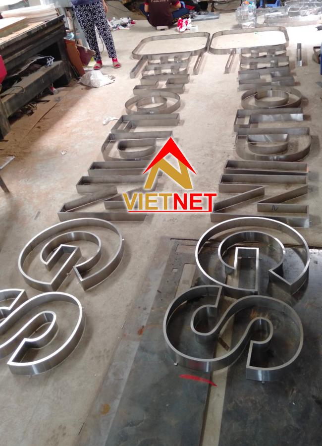Đây là bộ chữ inox trắng xước được thực hiện từ phương pháp gia công uốn nổi chữ inox. Thay vì những sản phẩm trước đây VietNet giới thiệu là những bộ chữ được thiết kế đầy đặn thì bộ chữ này chỉ uốn nổi và làm mặt chữ theo tỷ lệ yêu cầu khách hàng: Uốn nổi 6cm và mặt chữ 8zem.
